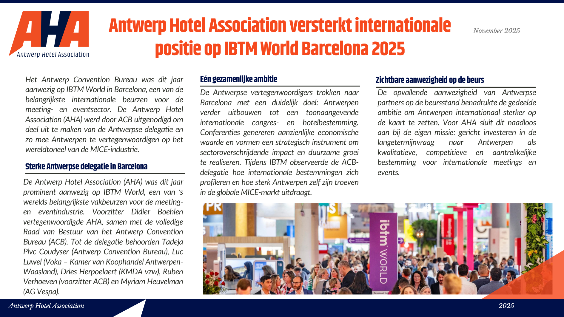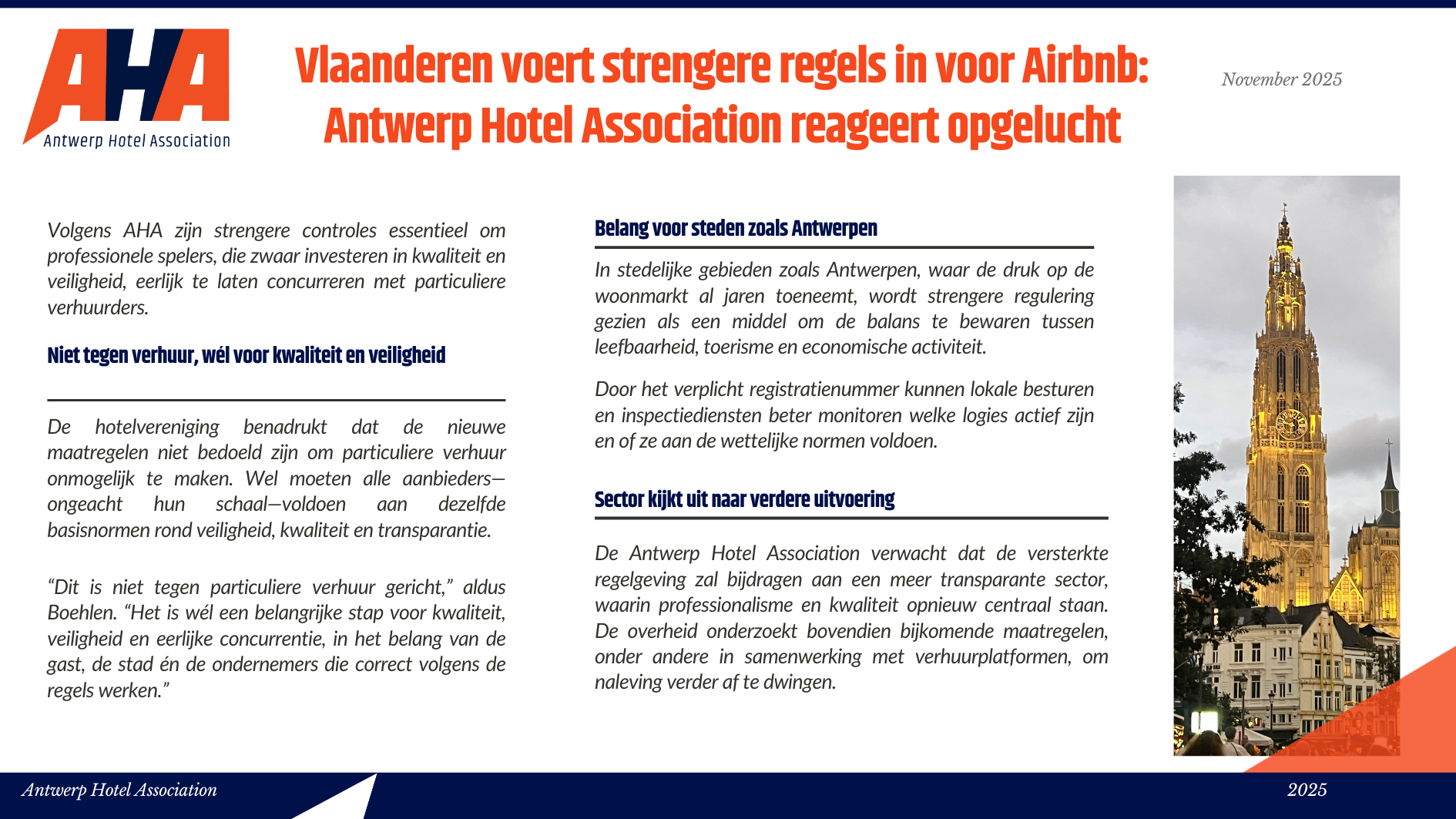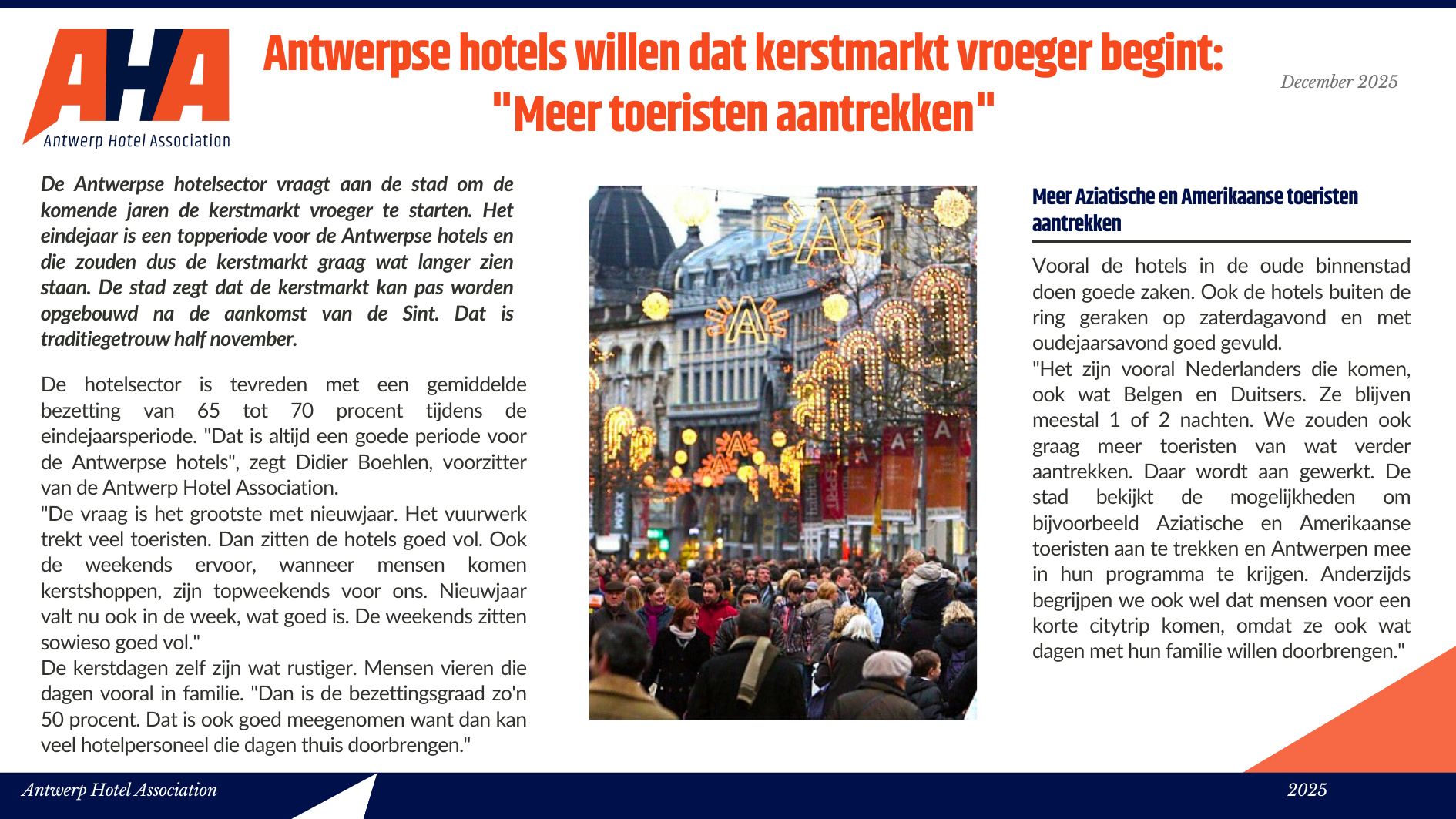 Niet alleen toeristen houden van het ruime culturele aanbod, de diverse shopping mogelijkheden en de lekkere gastronomische keuken, ook zakenlui vinden steeds meer hun weg naar ’t Stad. De Antwerpse hotels vonden het dan ook hoog tijd om de handen in elkaar te slaan en zich te verenigen in één associatie: Antwerp Hotel Association vzw. Met deze vereniging willen de Antwerpse hotels zichzelf promoten, het imago van de Antwerpse hotellerie in een positiever daglicht stellen en een aanspreekpunt zijn voor iedereen die de Antwerpse hotels nodig heeft. Kortom, één groot pluspunt voor de stad Antwerpen, zijn hotels én de hotelgasten.