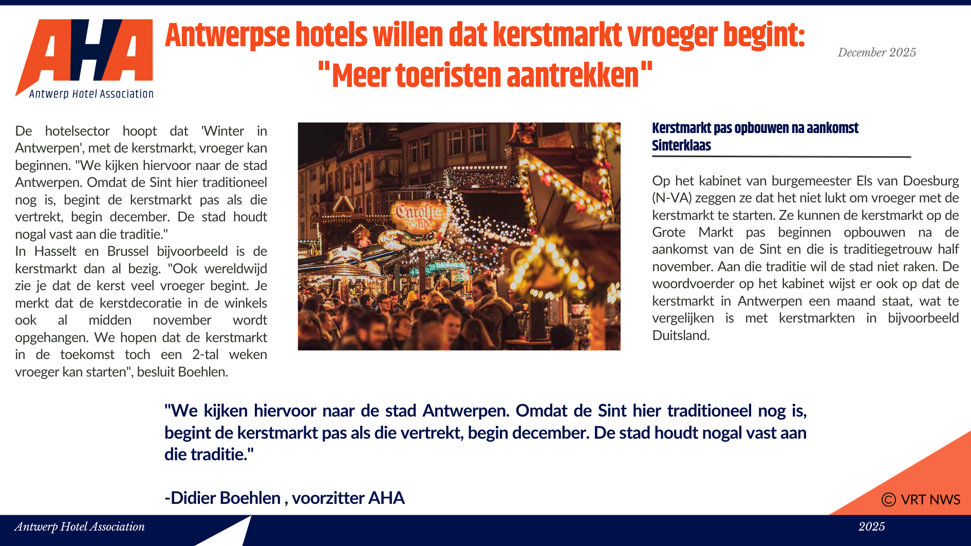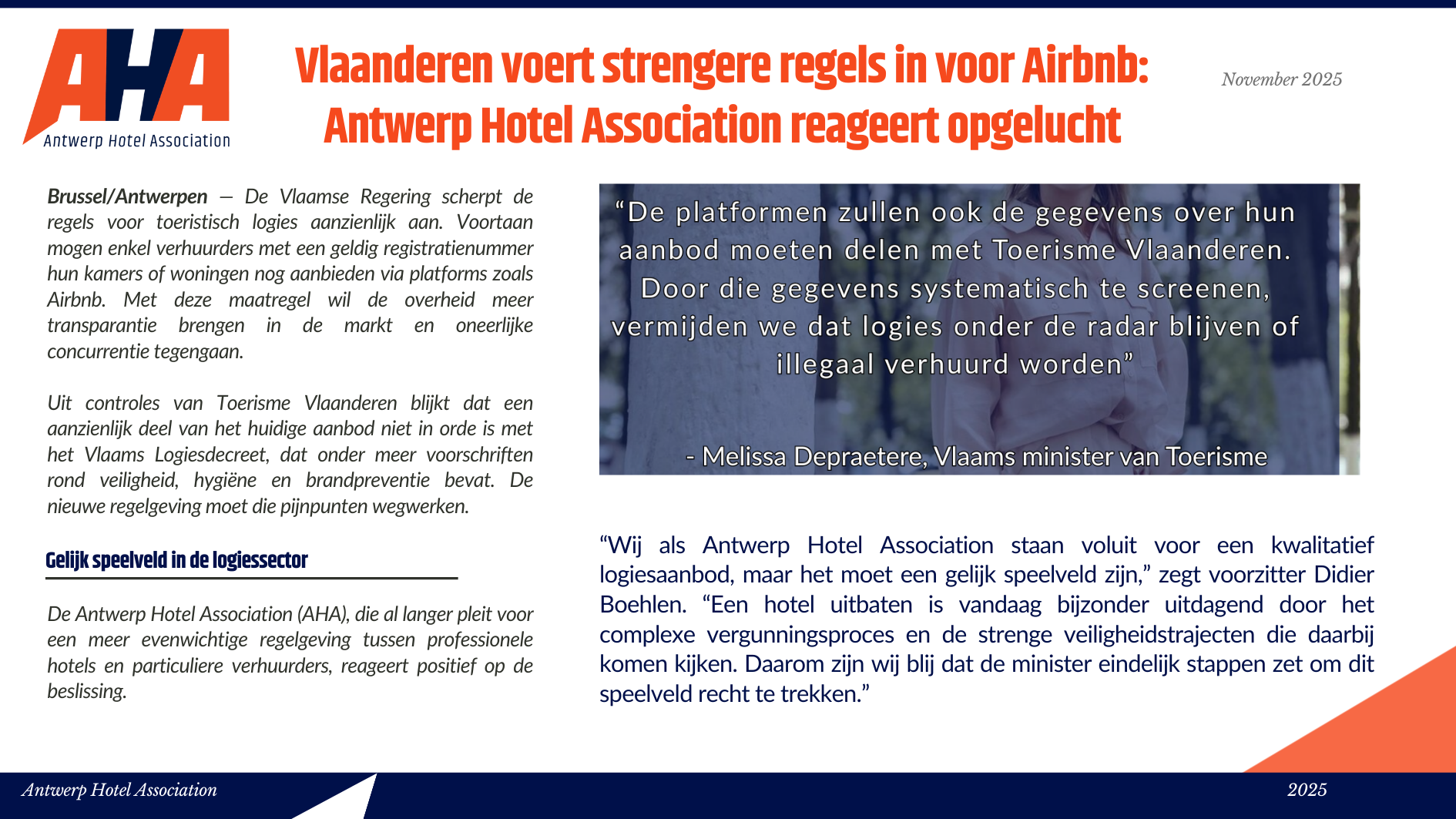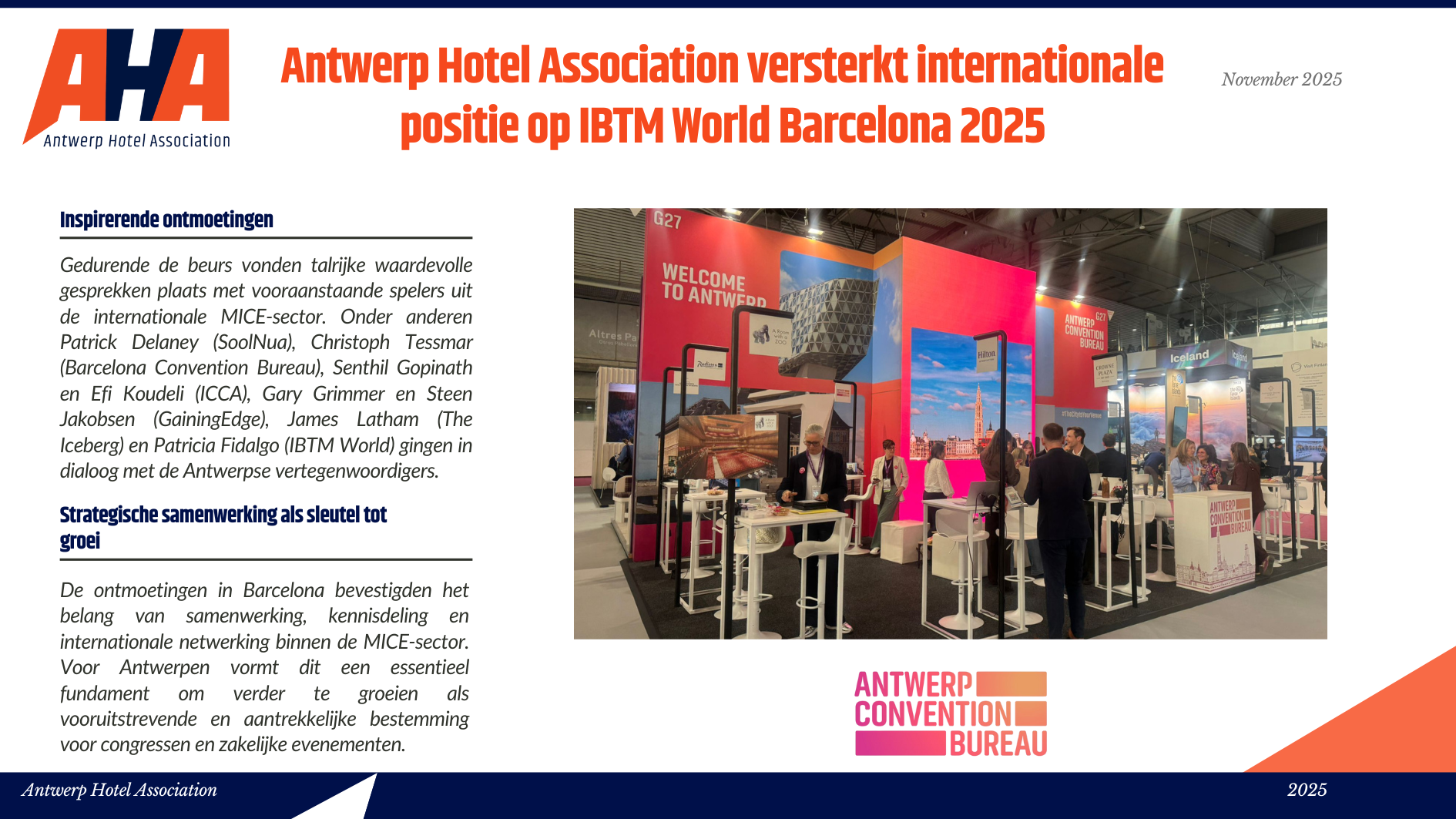 Niet alleen toeristen houden van het ruime culturele aanbod, de diverse shopping mogelijkheden en de lekkere gastronomische keuken, ook zakenlui vinden steeds meer hun weg naar ’t Stad. De Antwerpse hotels vonden het dan ook hoog tijd om de handen in elkaar te slaan en zich te verenigen in één associatie: Antwerp Hotel Association vzw. Met deze vereniging willen de Antwerpse hotels zichzelf promoten, het imago van de Antwerpse hotellerie in een positiever daglicht stellen en een aanspreekpunt zijn voor iedereen die de Antwerpse hotels nodig heeft. Kortom, één groot pluspunt voor de stad Antwerpen, zijn hotels én de hotelgasten.